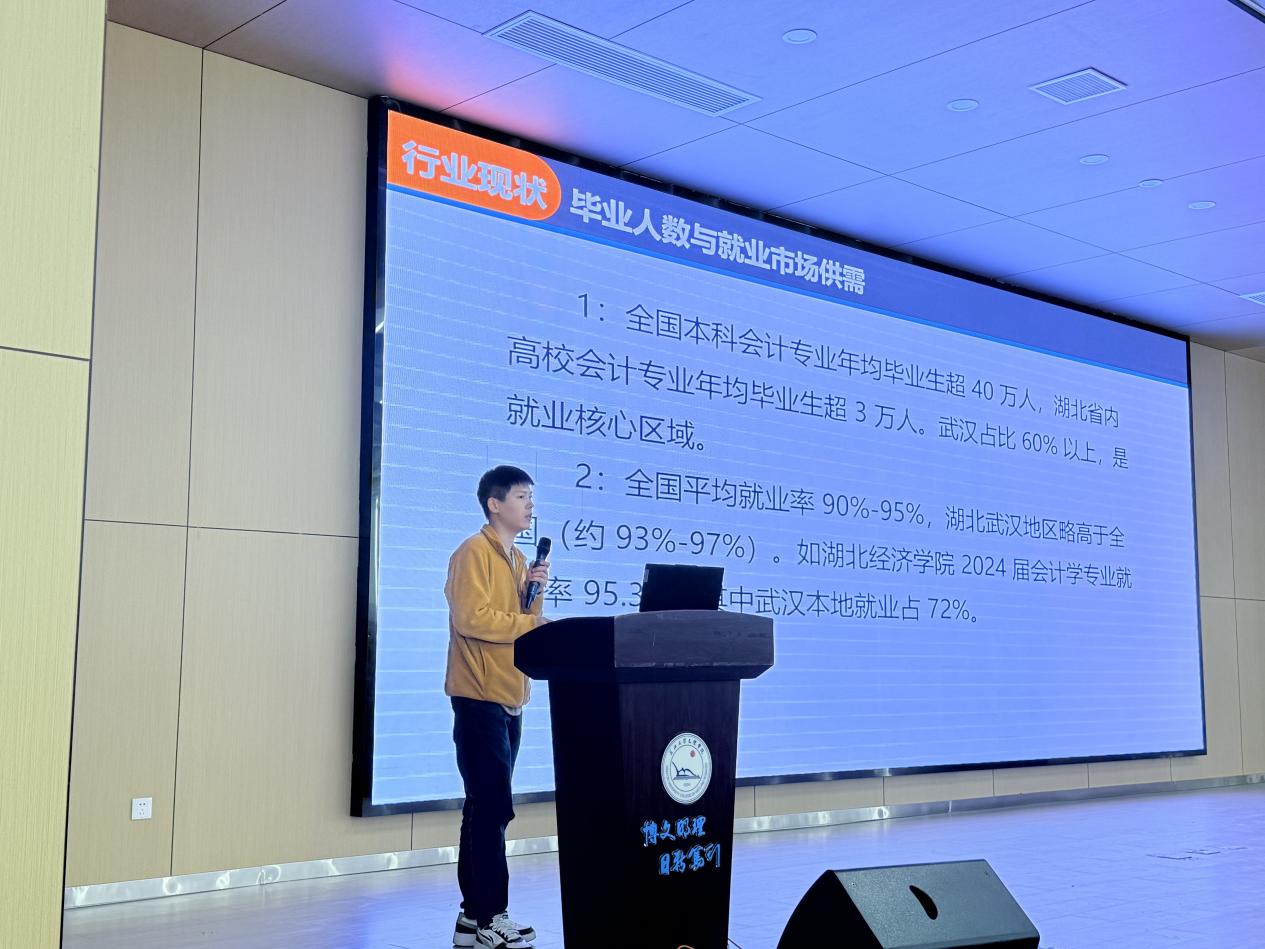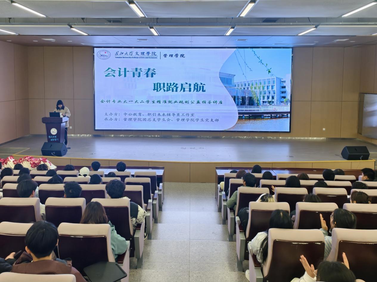 本网讯(通讯员 毛富鑫)为帮助大一、大二会计专业学生提前树立职业意识、明确发展方向,长江大学文理学院管理学院于 11 月 18 日 18:30 在 B-112 报告厅成功举办 “会计青春 职路启航” 精准就业规划公益指导讲座。本次活动由职引未来辅导员工作室精心打造,管理学院团学组织与学生党支部联合承办,聚焦低年级学生成长核心需求,充分彰显了学院在人才培养过程中的前瞻性布局与责任担当。