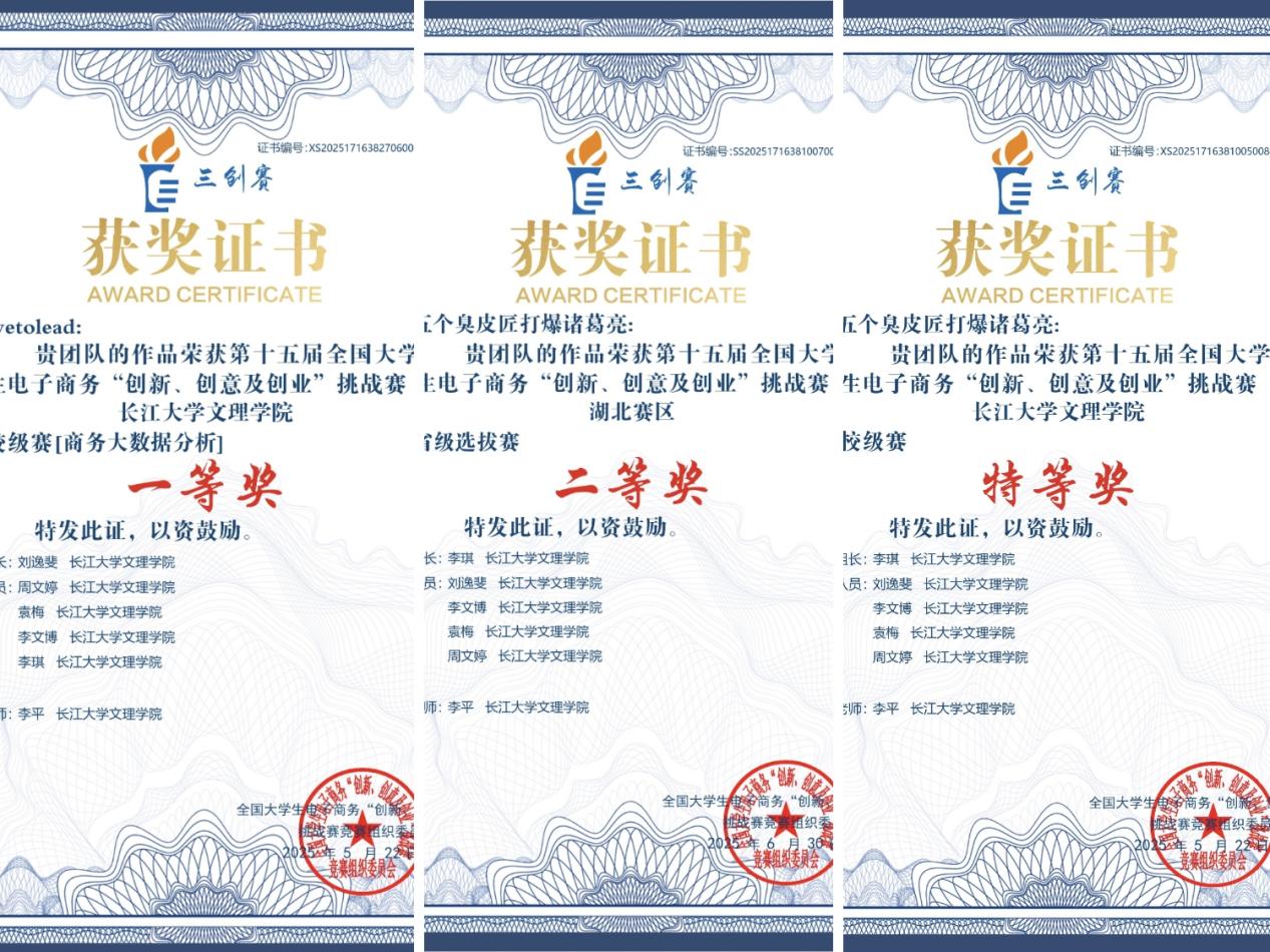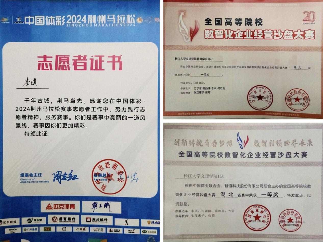 李琪获第十九届全国高等院校数智化企业经营沙盘大赛湖北省一等奖;获第二十届全国高等院校数智化企业经营沙盘大赛湖北省一等奖;获第十五届全国大学生电子商务“创新、创意及创业”挑战赛一个校级一等,一个校级特等,一个省级二等。