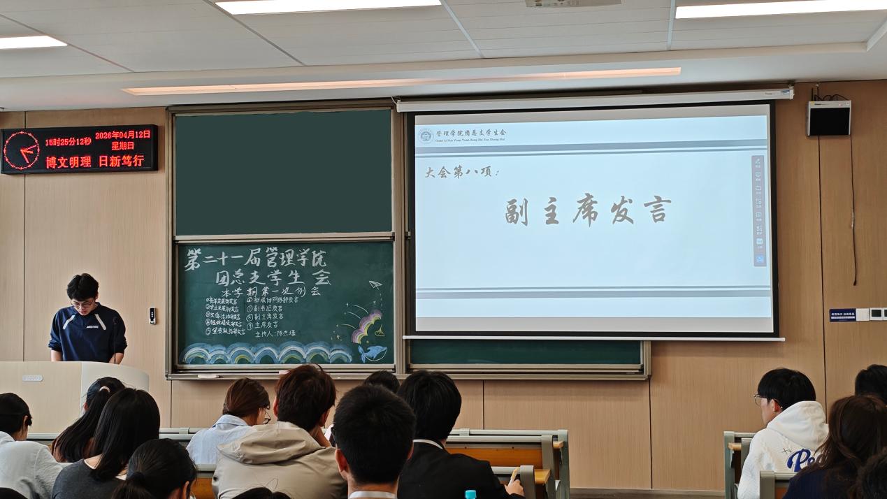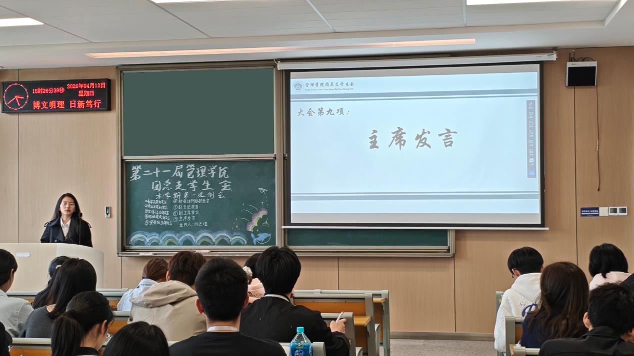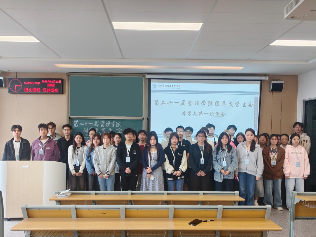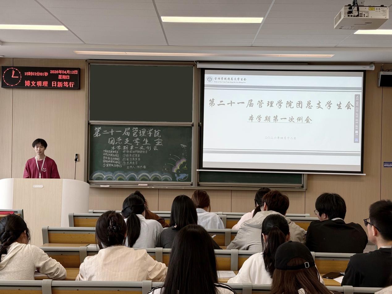 本网讯(通讯员 毛富鑫) 为进一步加强学生干部队伍建设,凝聚工作合力。2026年4月12日下午15:00,管理学院第二十一届团总支学生会本学期第一次例会在C-422教室顺利召开。会议由青年发展部陈杰壕主持,团总支学生会全体成员全员到场。