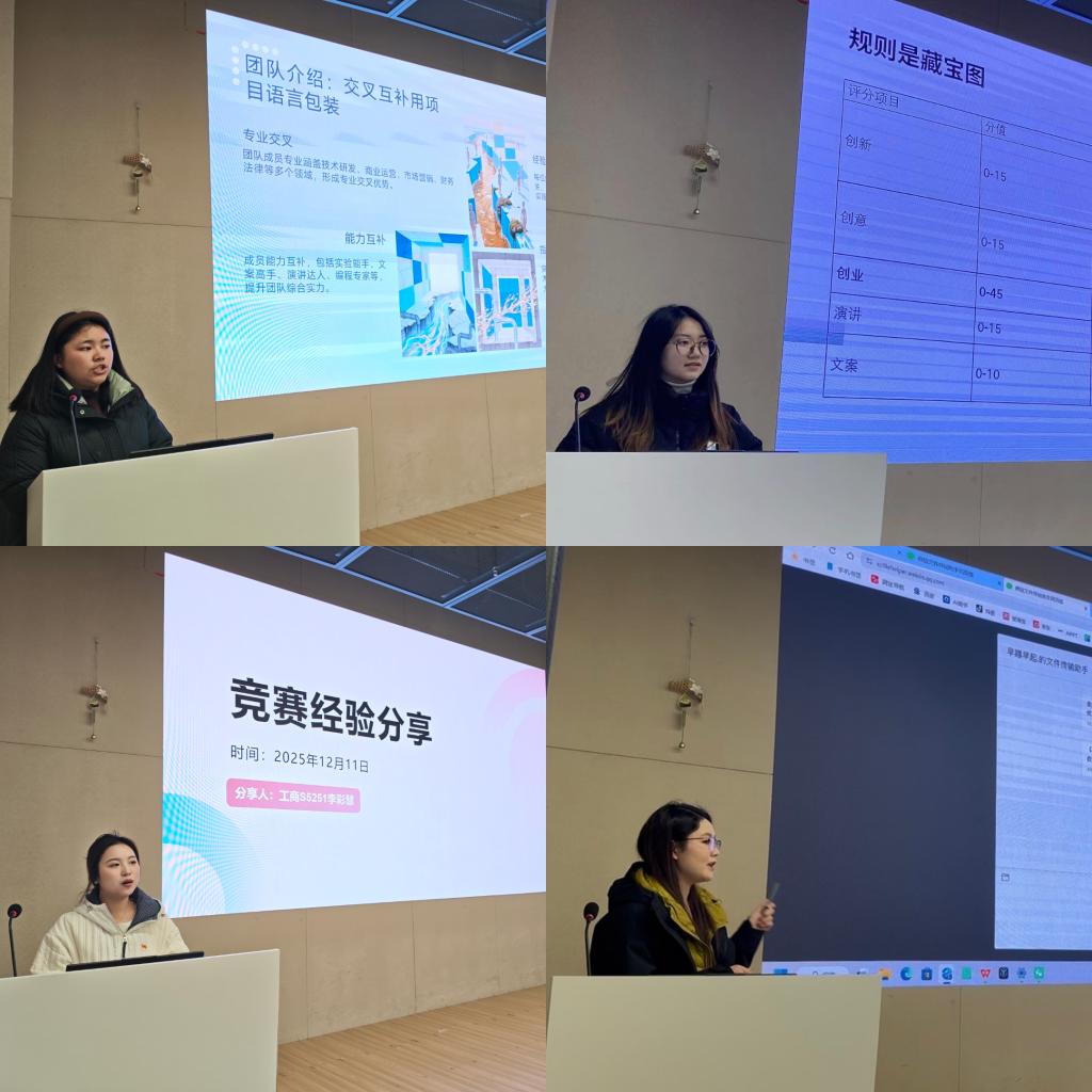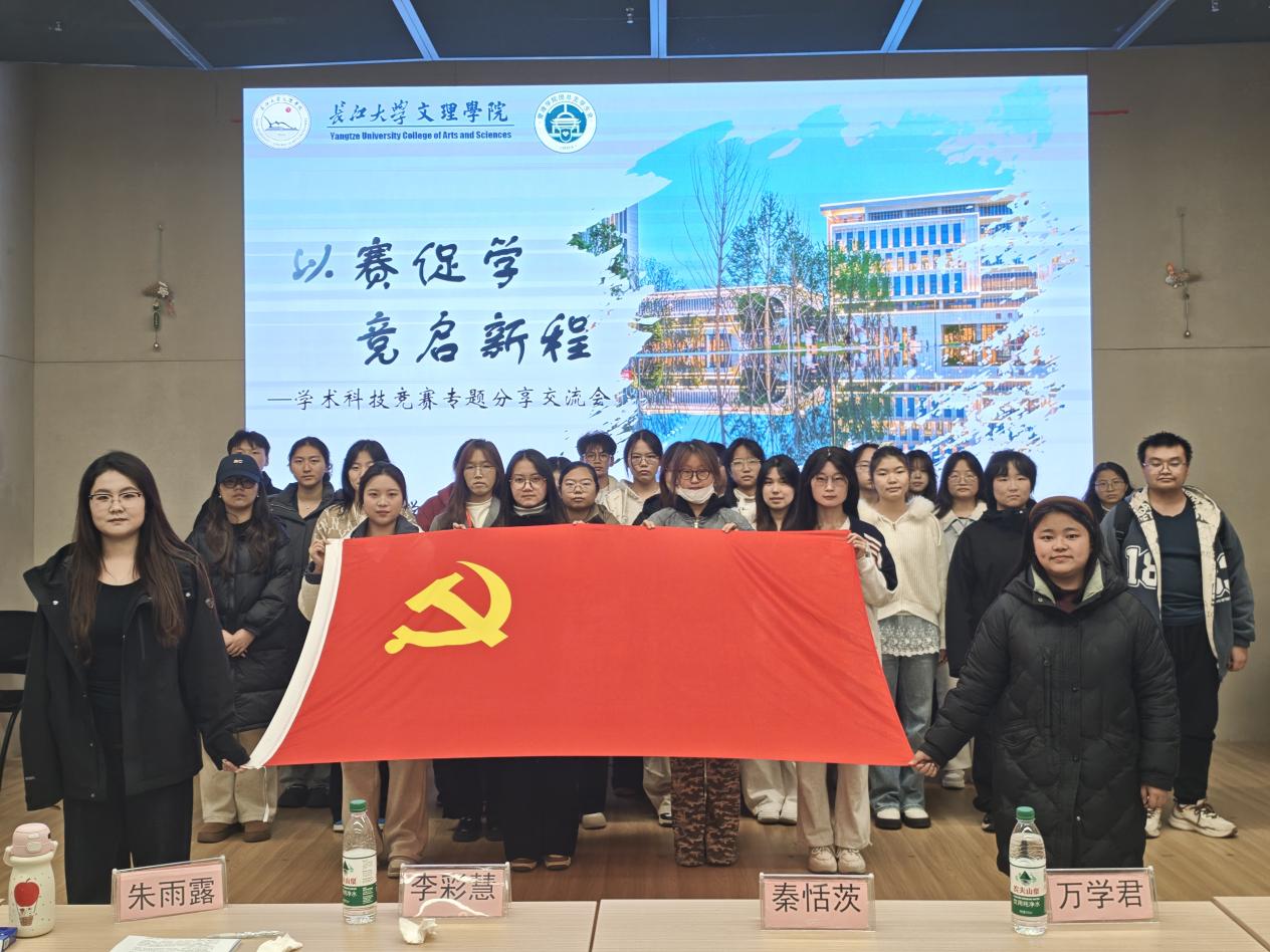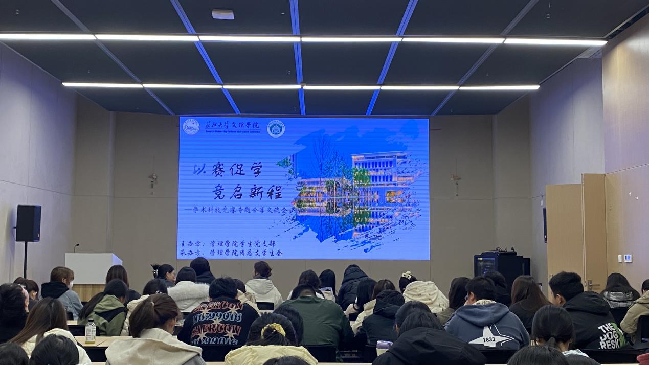 本网讯(通讯员 王钧玉)为推进实践教学体系的建设与创新,搭建竞赛经验传承平台,助力学生实践能力提升,长江大学文理学院管理学院于2025年12月11日下午16:15在图书馆103报告厅成功举办“以赛促学·竞启新程”学术科技竞赛专题分享交流会,本次交流会由管理学院学生党支部主办、管理学院团总支学生会承办,青年发展部唐凌锴主持,特邀在“挑战杯”、“三创赛”等竞赛中屡获佳绩的万学君、秦恬茨、李彩慧和朱雨露四位优秀学子担任分享嘉宾,管理学院各级同学共同参与。