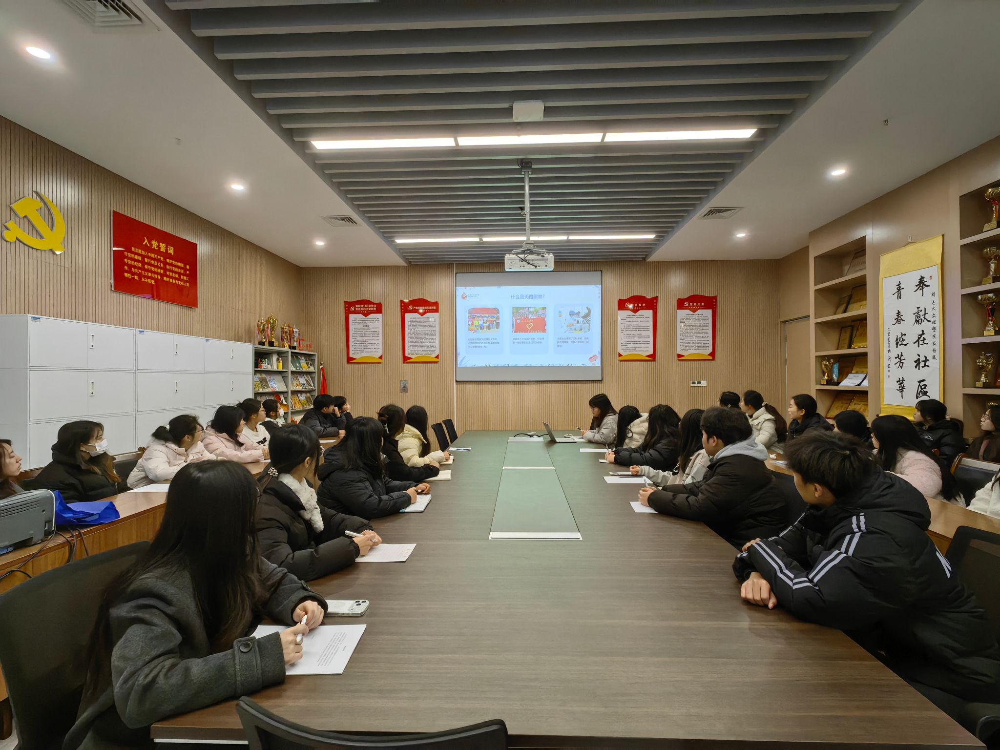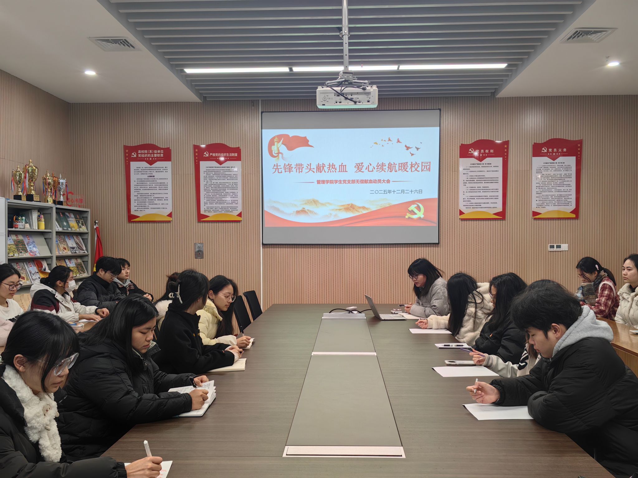 本网讯(通讯员 黄江琴)为发挥学生党员的先锋模范作用,以实际行动践行社会责任,12月26日,管理学院学生党支部组织召开“先锋带头献热血,爱心续航暖校园”献血动员大会。会议旨在通过党组织动员,鼓励学生党员带头参与献血,并积极带动广大同学投身公益,在校园内传递奉献与温暖。