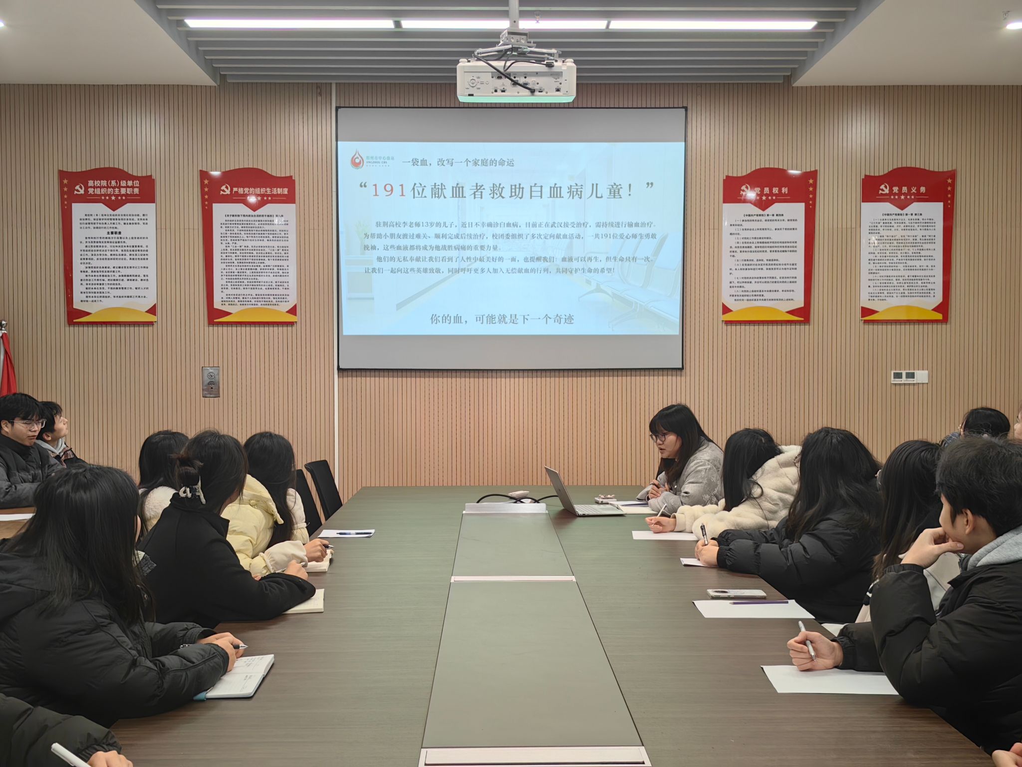 会上,学生党支部书记杨琪老师围绕“为何献血”“献血的益处”“献血常识普及”以及“荆州地区血液紧缺现状”四个方面展开讲解。她强调,血液是临床救治不可替代的生命资源,每一次无偿献血都可能成为挽救生命的关键,学生党员更应主动担当、率先垂范,将奉献精神落到实处。
