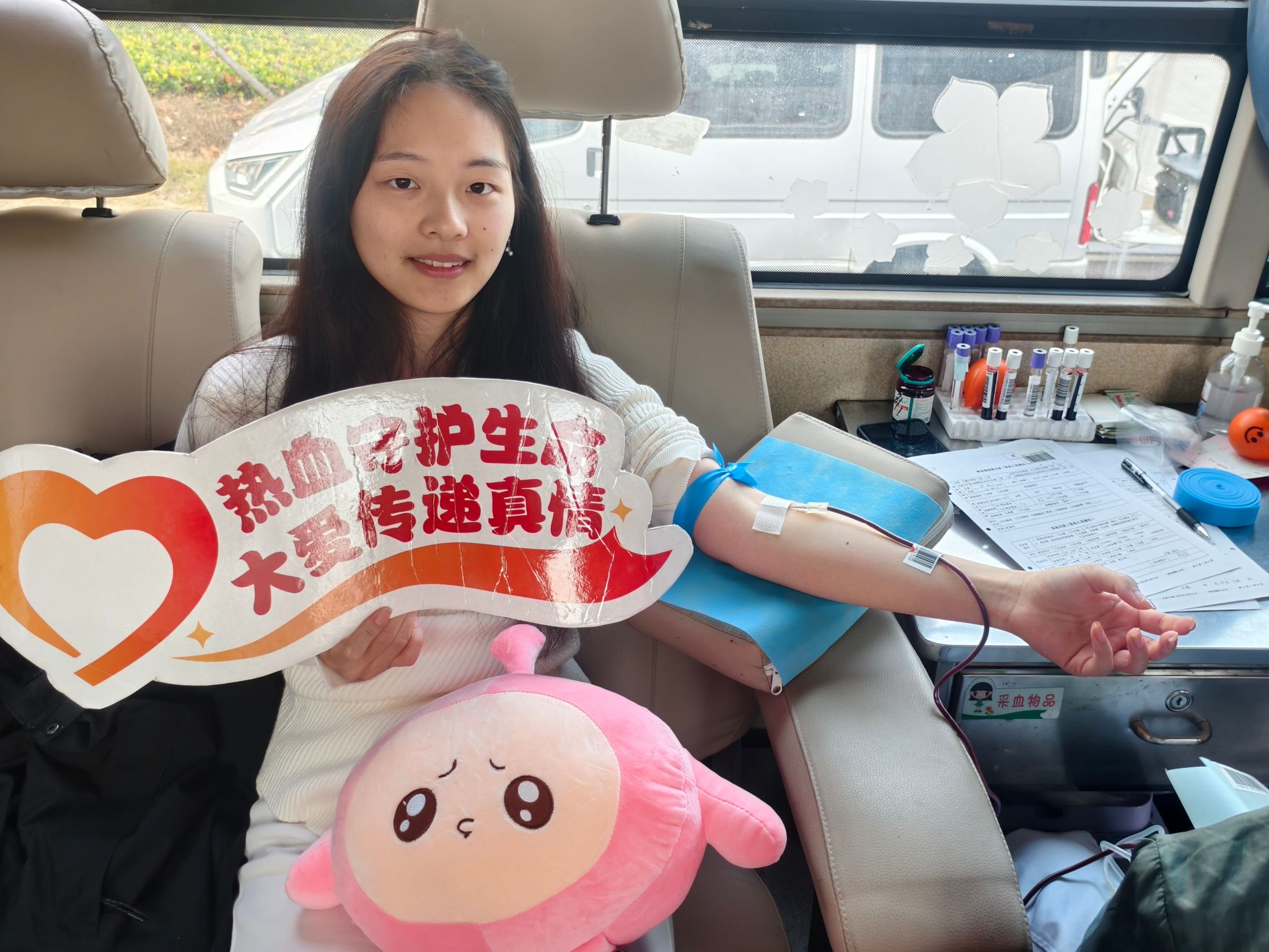支部成员们早早来到现场,在流动献血车前自觉排起队伍。他们胸前佩戴的党员徽章在阳光下格外醒目。从填写登记表、接受健康检查,到登上采血车挽袖献血,每一个环节他们都秩序井然、沉着从容。当采血针刺入臂膀时,他们脸上洋溢着奉献的坚定与自豪。部分党员在完成献血后,并未立即离开,而是主动协助医护人员和志愿者维持秩序、照顾献血同学,将温暖从献血车传递到更远处。