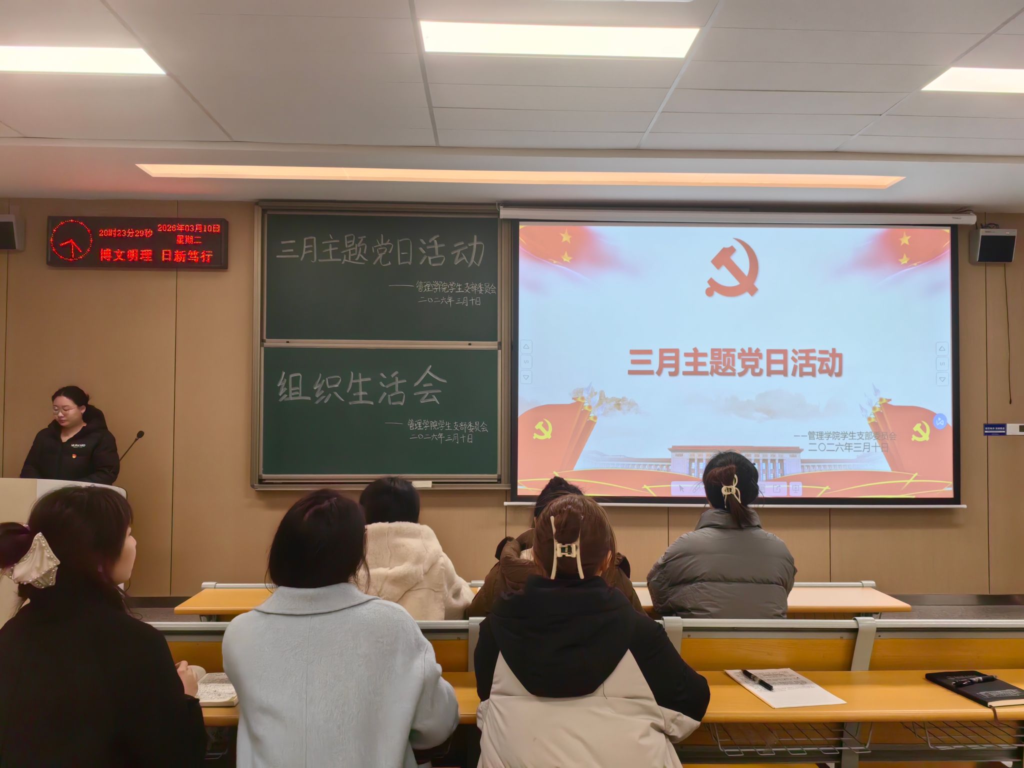 本网讯(通讯员 黄江琴)3月10日,管理学院学生党支部在教学楼A-402召开三月主题党日活动,支部全体党员参加。本次活动以“扎实开展树立和践行正确政绩观学习教育”为主题,旨在引导党员同志深刻领会习近平总书记关于树立和践行正确政绩观的重要论述,深入学习贯彻党中央最新精神,切实将正确政绩观内化于心、外化于行。会议由汪李雨涵同志主持。