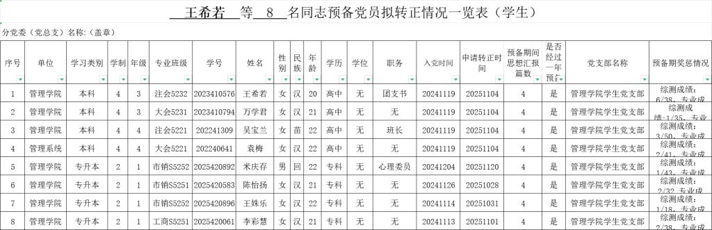 经过党支部对预备党员1年的培养教育和考察,经支委会研究确定,报党总支(或分党委)审查同意,将于近期召开党员大会讨论王希若等8名同志预备党员转正,特在全校师生范围内进行公示。