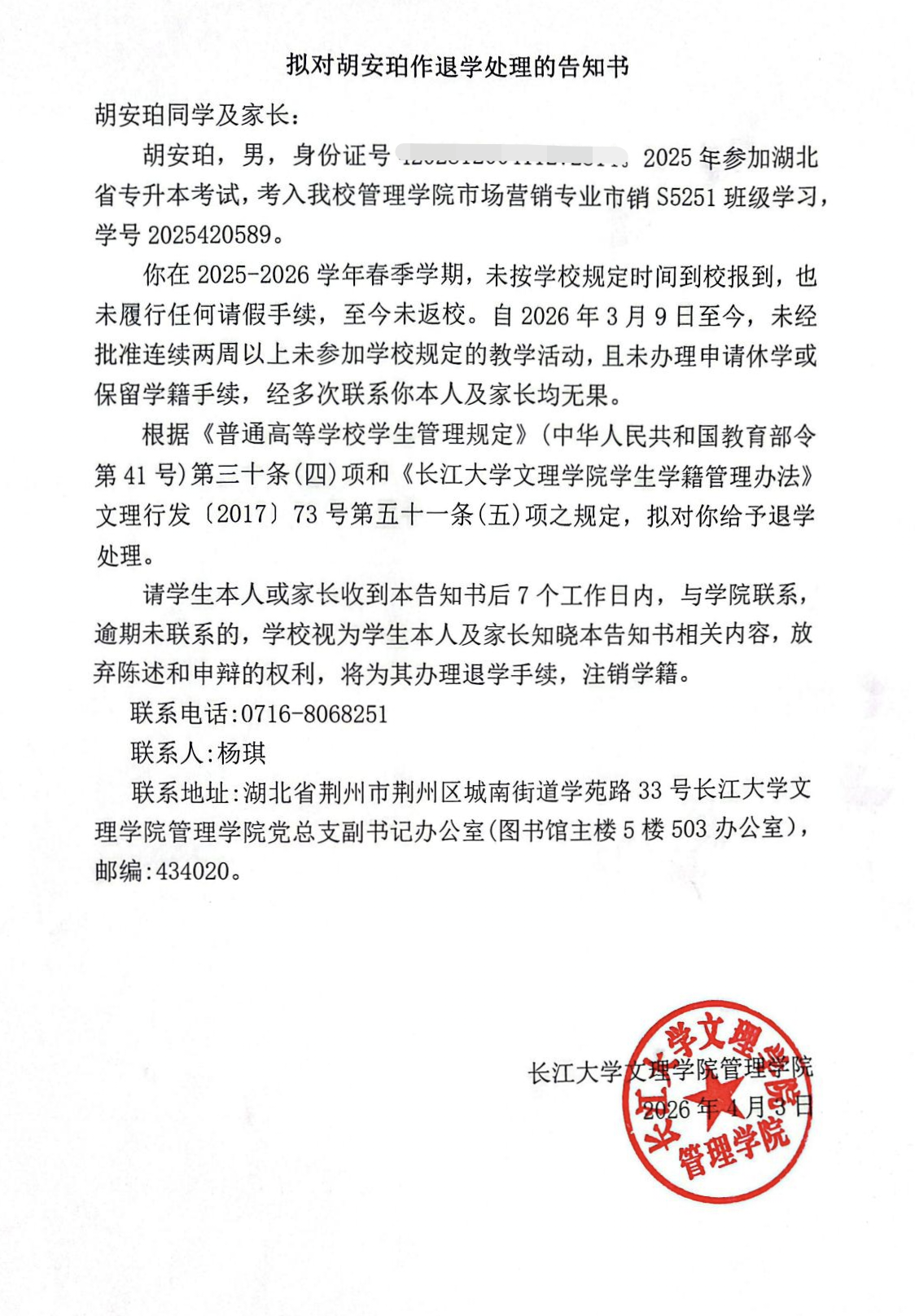 胡安珀,男,学号2025420589。2025年参加湖北省专升本考试,考入我校管理学院市场营销专业市销S5251班学习。该生在2025-2026学年春季学期未按学校规定时间到校报到,也未履行任何请假手续,至今未返校;自2026年3月9日至今,未经批准连续超过两周未参加学校规定的教学活动,也未办理申请休学或保留学籍手续。学校老师经多次联系学生本人和家长,均无果。