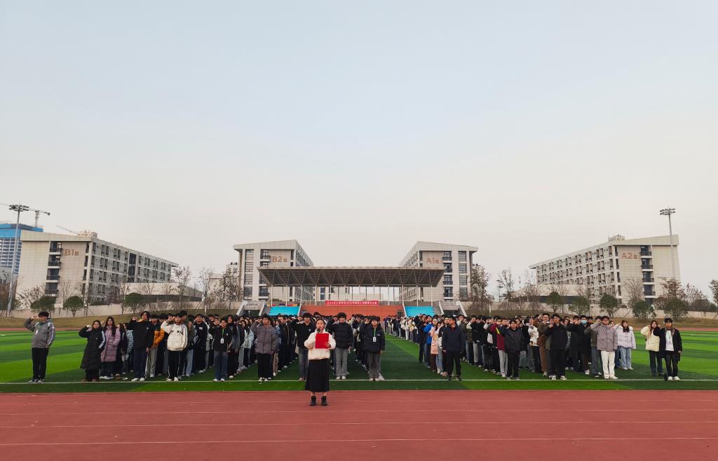 本网讯(王思雨/文 网络宣传部/摄)12月8日清晨,学院在田径场举行“传承一二·九精神,勇担青春使命”主题升旗仪式。仪式由学院学生会综合办公室江心悦主持,学院全体师生参加。