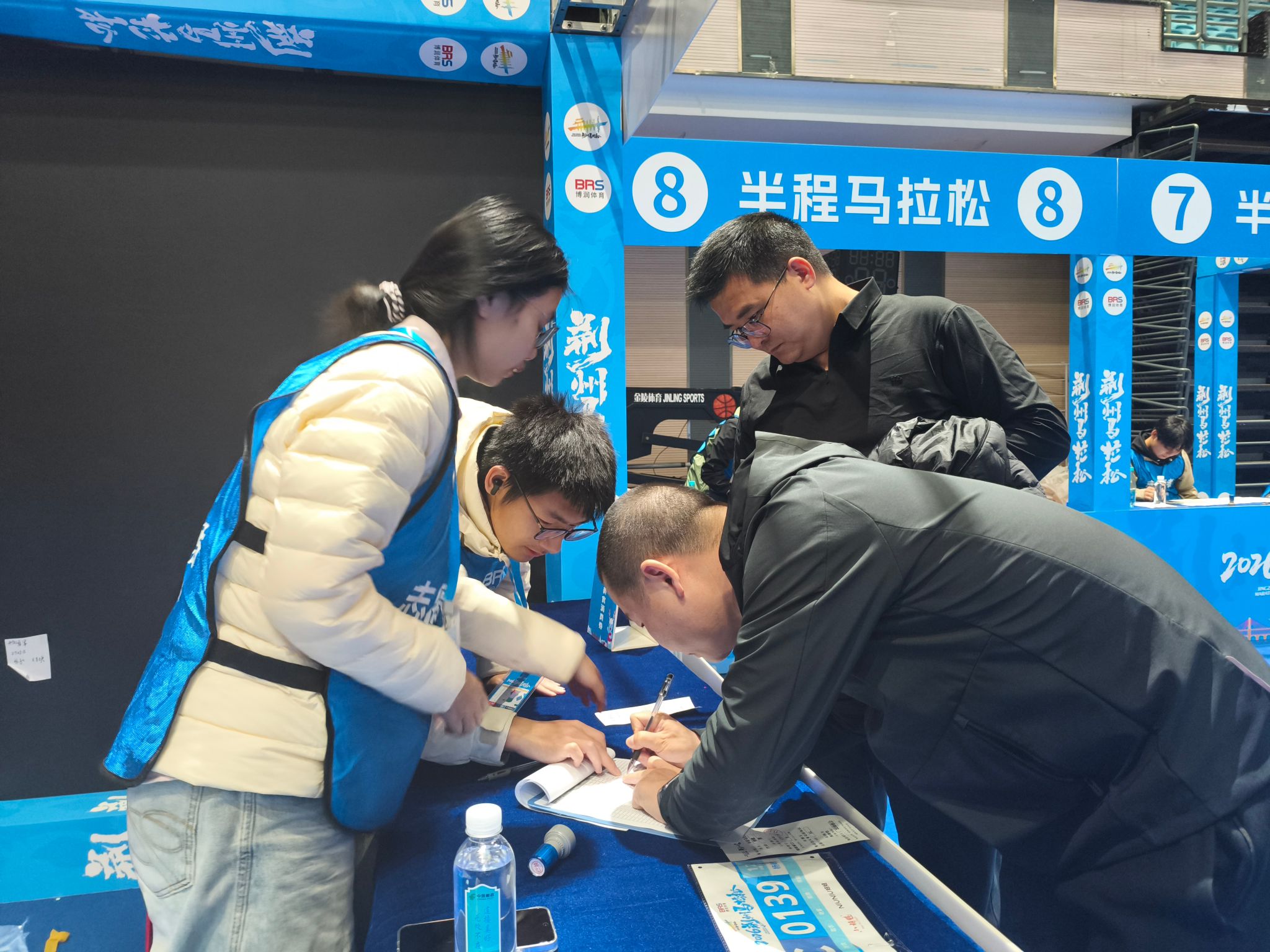 为全力保障赛事顺利进行,40 名志愿者早早抵达指定岗位,分驻20个号码布发放窗口,以饱满的热情、专业的态度迎接每一位参赛选手。志愿者们严格遵循“凭小票取号”的原则,全程坚守岗位,将选手号码布整齐摆放,确保存取流程高效有序。面对选手们的各种问题,志愿者们耐心解答,确保每位选手都能顺利拿到自己的号码布。在分发过程中,志愿者们分工明确、配合默契,高效有序地完成了任务。他们用温暖的笑容和贴心的服务,让参赛选手感受到了荆马赛事的关怀与热情。