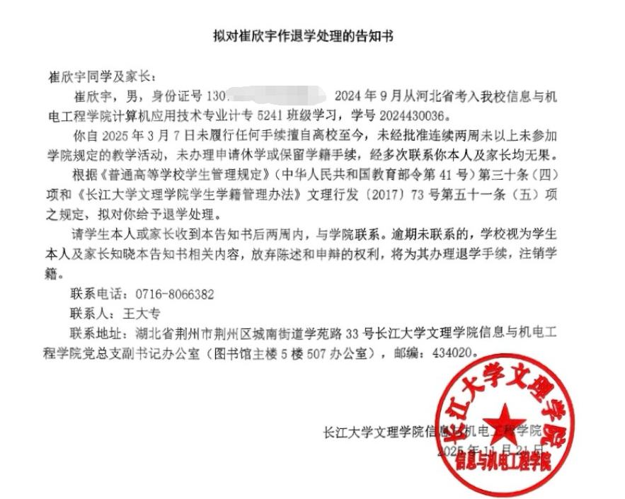 崔欣宇,男,学号2024430036。2024年9月从河北省考入我校信息与机电工程学院计算机应用技术专业计专5241班级学习。该生于2025年3月7日起未履行任何请假手续擅自离校,至今未返校;未经批准连续两周未参加学校规定的教学活动,也未办理申请休学或保留学籍手续;学院老师经多次联系学生本人和家长,均无果。