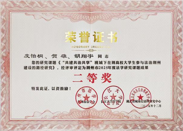 12月2日,湖北省荆州市第六次荆江法治学术研讨会(原荆江法治论坛)成功举行。荆州市法学会、长江大学法学院、湖北省域基层治理研究中心发布了《关于荆州市2025年度法学研究课题评审结果的通报》(荆法会〔2025〕5号),我系法学专业教师皮怡桐主持完成的《“共建共治共享”视域下在荆高校大学生参与法治荆州建设的路径研究》课题荣获二等奖。