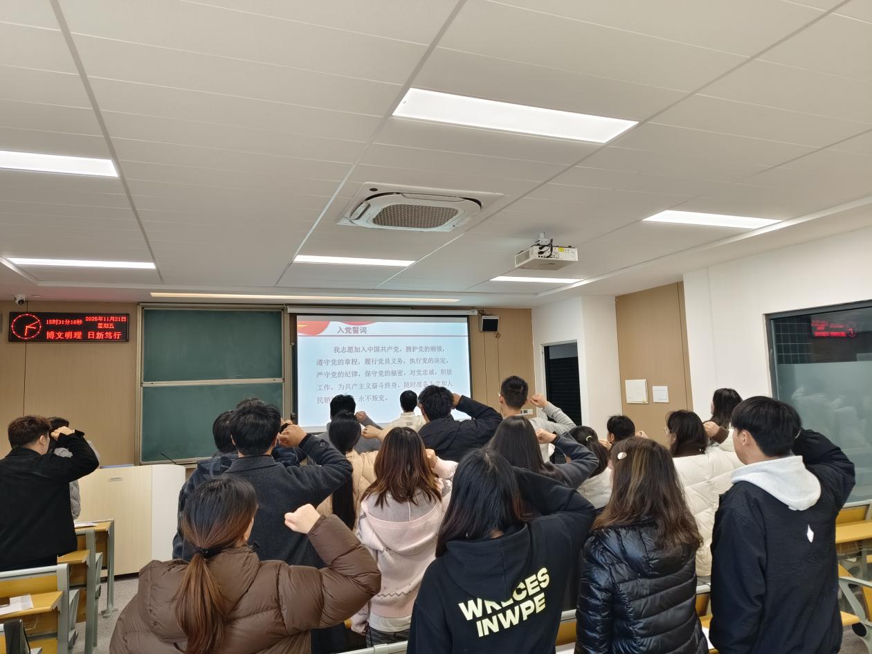 会议最后,杨杉杉对以上同志表示衷心祝贺,同时提出三点要求:一是锚定政治方向,始终把坚定理想信念摆在首位,持续深化党的创新理论学习,深刻领悟“两个确立”的决定性意义,自觉践行“两个维护”,以理论自觉筑牢政治忠诚根基;二是坚持学用贯通,立足学生党员身份,既要深耕专业知识锤炼过硬本领,又要主动将理论学习与校园服务、社会实践结合,在学业科研中争当表率,在帮扶同学、校园治理中主动作为,实现素养与能力双提升;三是严守纪律底线,以党章党规党纪为行为准则,强化规矩意识与自律意识,永葆党员清正作风,主动亮身份、扛责任,以务实行动带动身边同学共同进步,践行全心全意为人民服务宗旨。