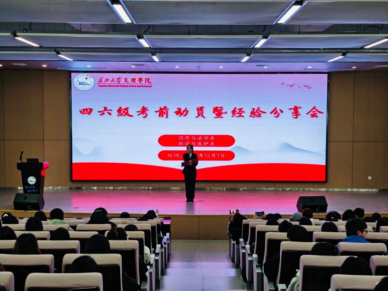 本网讯(见习记者:陈世行)为切实解决同学们在英语四六级备考过程中面临的困难,明确复习方向,凝聚迎考信心,12月7日,经济与法学系联合数学与医护系于报告厅B-112共同举办英语四六级动员暨经验分享会。会议特别邀请了数学与医护系党总支书记燕梦蝶担任主讲老师,经济与法学系辅导员卢佳智、刘曼莹、滕宋云,2024级全体学生及2025级部分学生代表参加本次会议。本次会议由秘书处何俊雯主持。