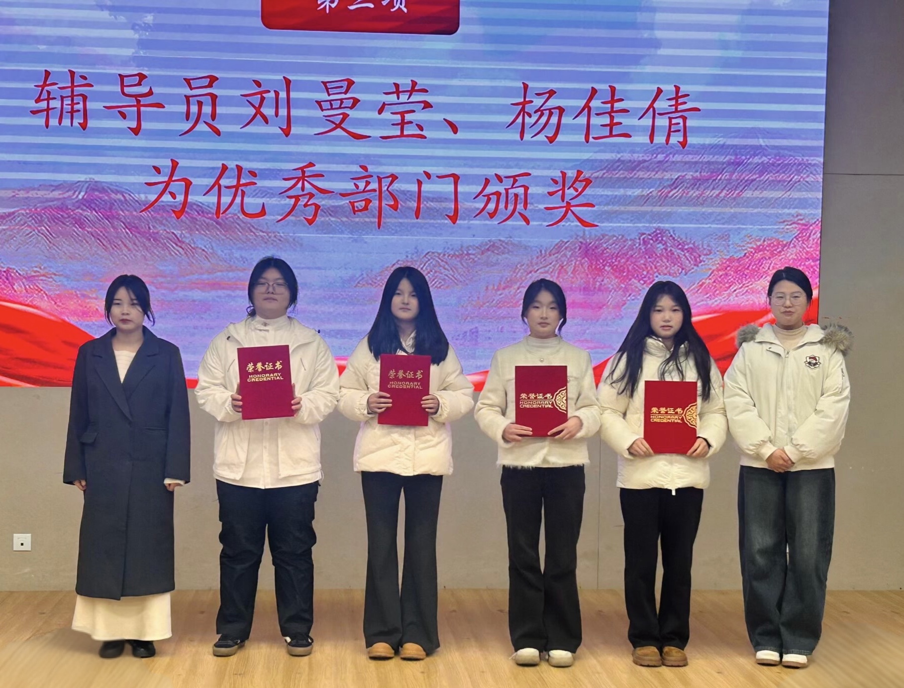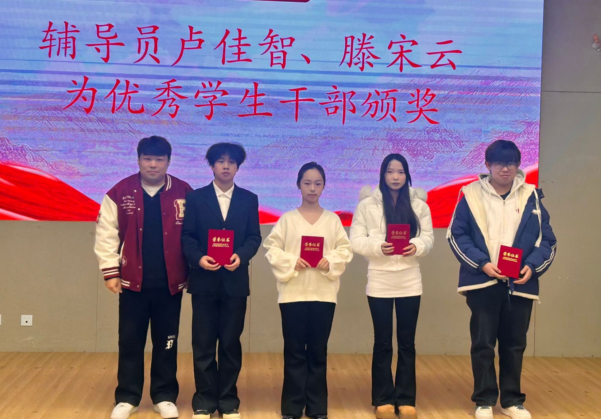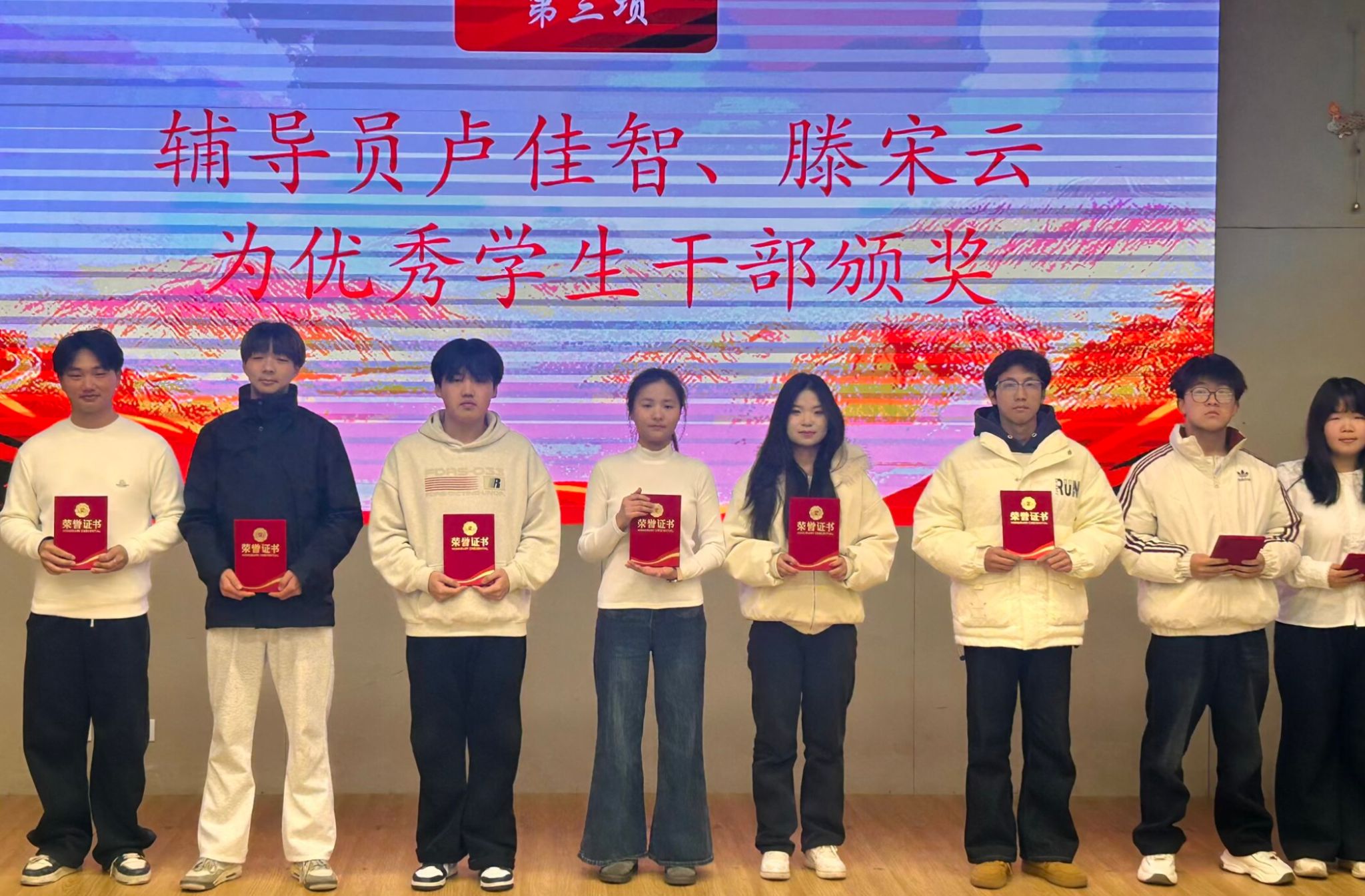 大会第二项,卢佳智宣读2025年度表彰文件。辅导员卢佳智、滕宋云为优秀学生干部颁发荣誉证书,辅导员刘曼莹、杨佳倩为优秀部门代表颁奖。