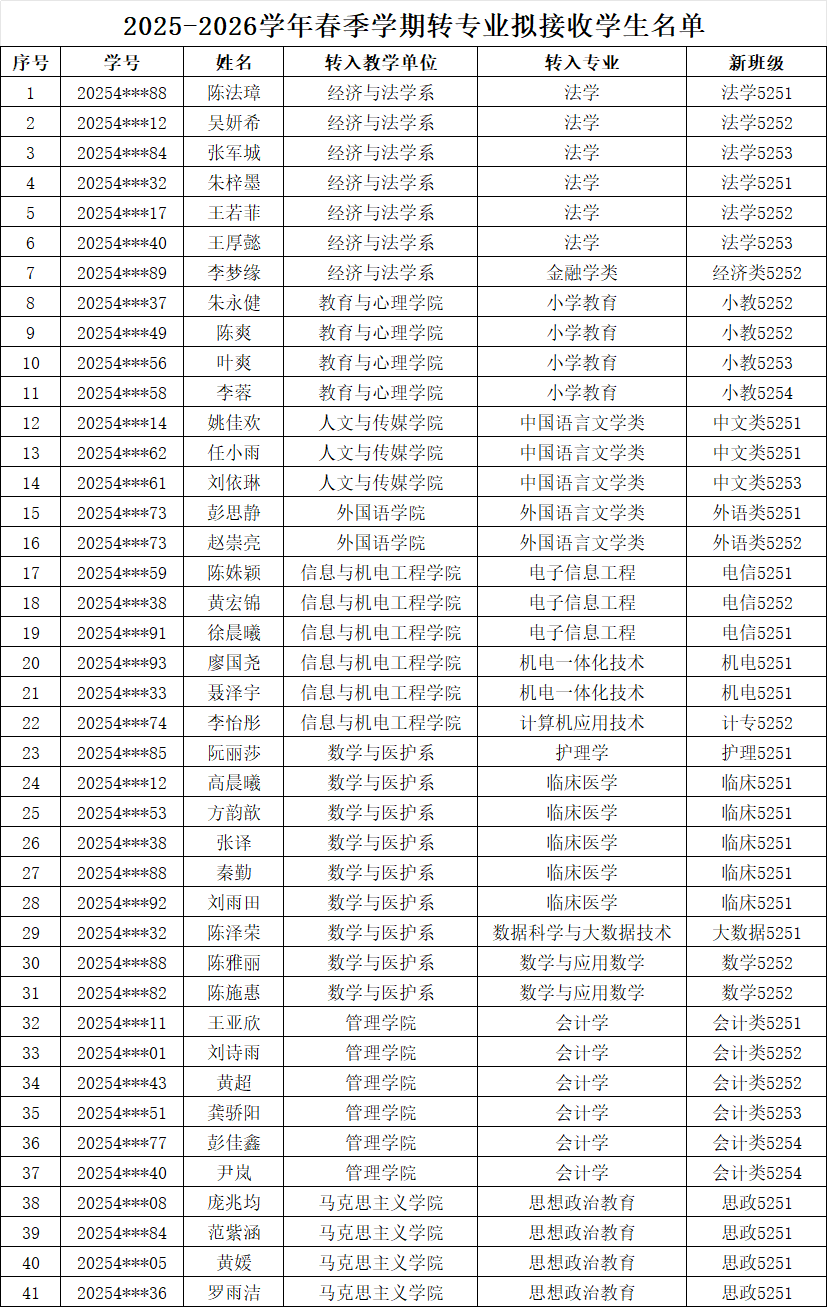 根据《长江大学文理学院专业分流与转专业管理办法》(文理行发〔2025〕21号)文件精神,按照转专业相关工作要求,经学生本人申请、招生处及所在教学单位审核、申请转入教学单位综合考核、教务处复核,拟同意陈法璋等41名同学转入新专业学习,现将结果予以公示(见附表)。