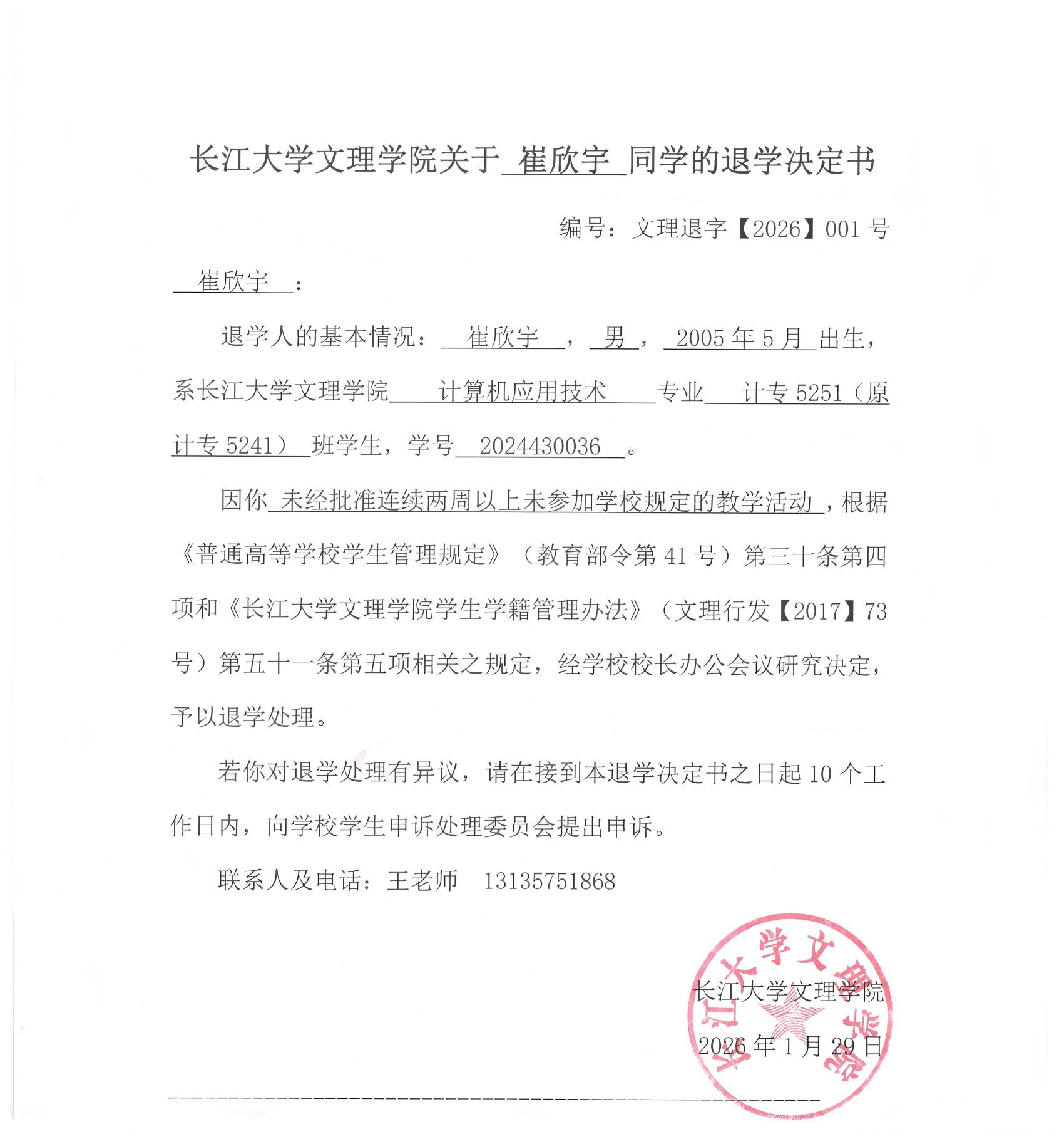 图《长江大学文理学院关于崔欣宇同学的退学决定书》