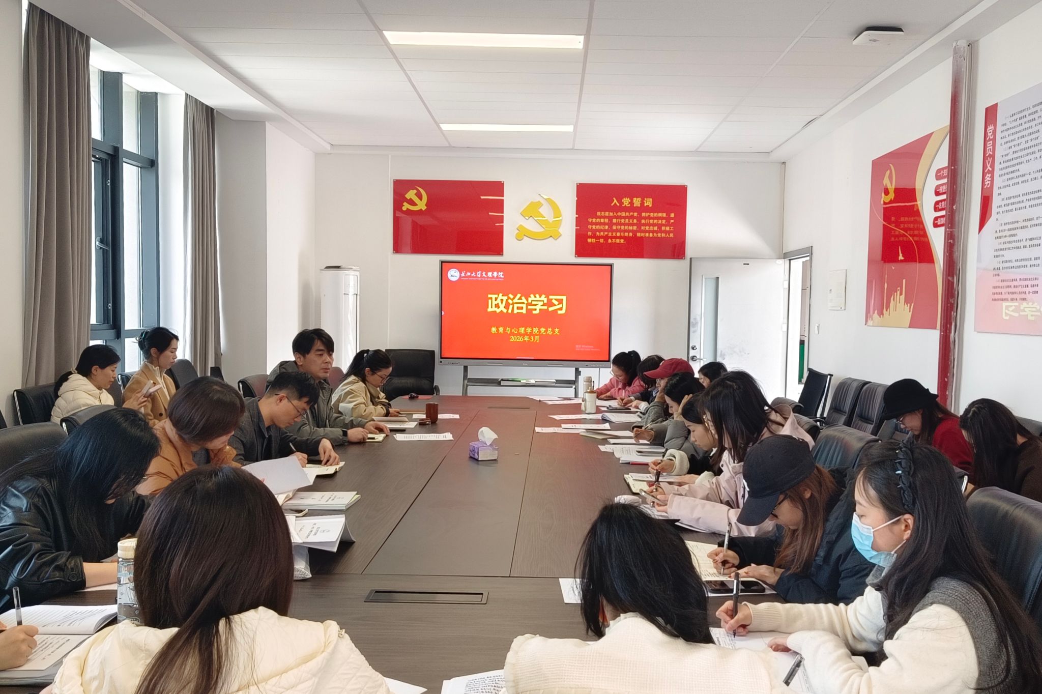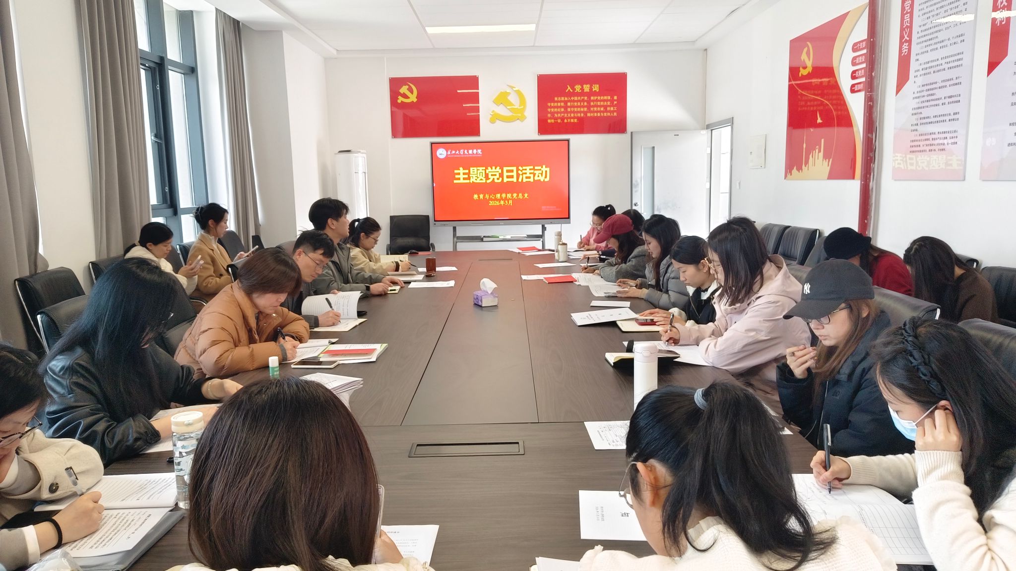 在支部主题党日活动中,全体党员重温入党誓词、交纳党费,集体学习《中国共产党章程》(第四章);学习中办印发《通知》,在全党开展树立和践行正确政绩观学习教育;学习王忠林主持召开省委常委会(扩大)会议,深入学习贯彻习近平总书记重要论述、扎实开展树立和践行正确政绩观学习教育;学习2026年全省教育工作会议精神;学习新时代高校思政课建设工作推进会精神;学习长江大学文理学院2025年工作总结表彰暨2026年工作部署会精神等内容。