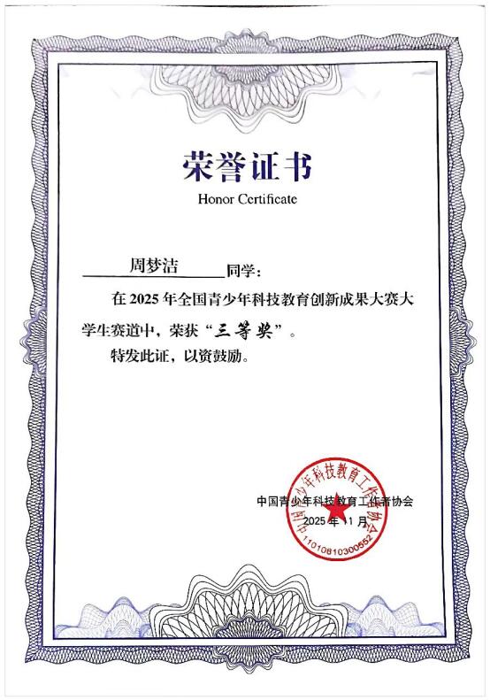 通讯员(图文/周梦洁)近日,2025年全国青少年科技教育创新成果大赛在华中师范大学圆满闭幕。我院小学教育专业学生周梦洁(指导教师:张一诺)设计的教学作品《拉力》荣获三等奖。