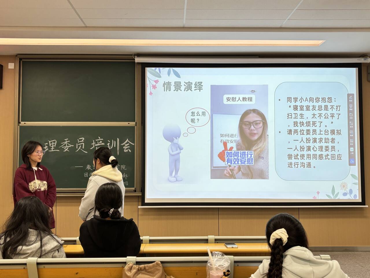 培训以“女巫的毒药”破冰开场,快速活跃了现场氛围,为后续环节有序推进做好铺垫。内容紧扣人际关系沟通与朋辈心理帮扶两大核心,循序渐进展开教学:先是聚焦积极倾听核心,抽象拆解四大倾听原则;再通过宿舍矛盾实景演绎,以同感式回应技巧演练,帮助心理委员掌握“3F倾听法”、规避沟通误区;最后将冰山理论与心理异常典型案例巧妙融合,指导心理委员明确原则、规范危机干预流程。培训尾声,李老师围绕如何高效开展朋辈帮扶、筑牢班级心理防线关键议题,与参会人员深入交流并传授实操技巧,进一步凝聚学院心理育人工作共识。