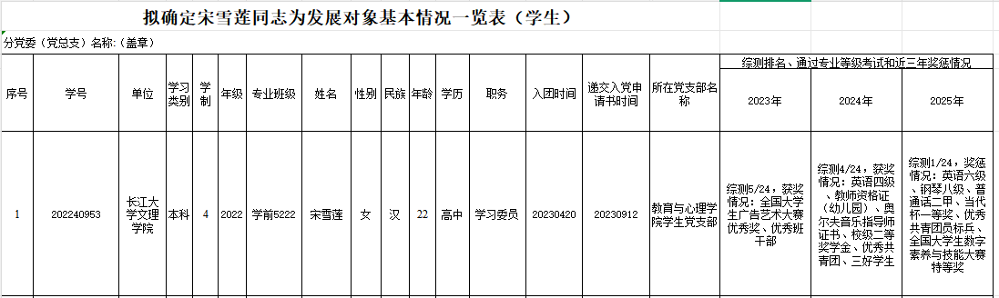 经党支部培养教育和考察,在听取培养联系人、党员和群众意见的基础上,经支部委员会研究,报上级党委备案同意,将宋雪莲同志列为发展对象。为保证发展新党员的质量,加强对发展党员工作的民主监督,现将发展对象有关情况进行公示。