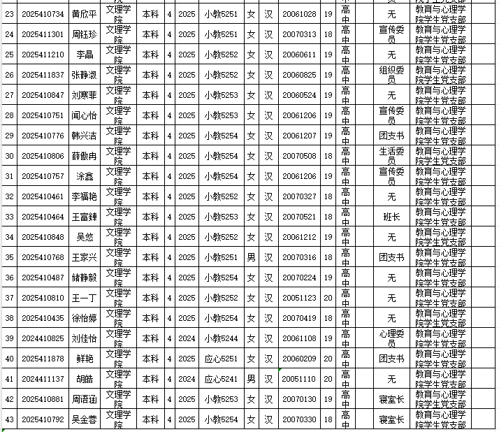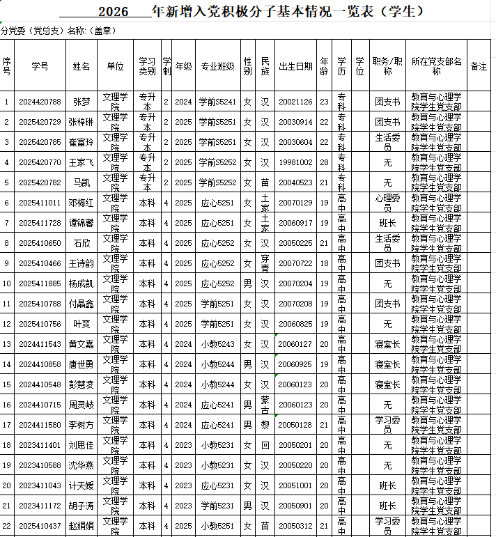 附:拟确定张梦等43名同志为入党积极分子基本情况一览表