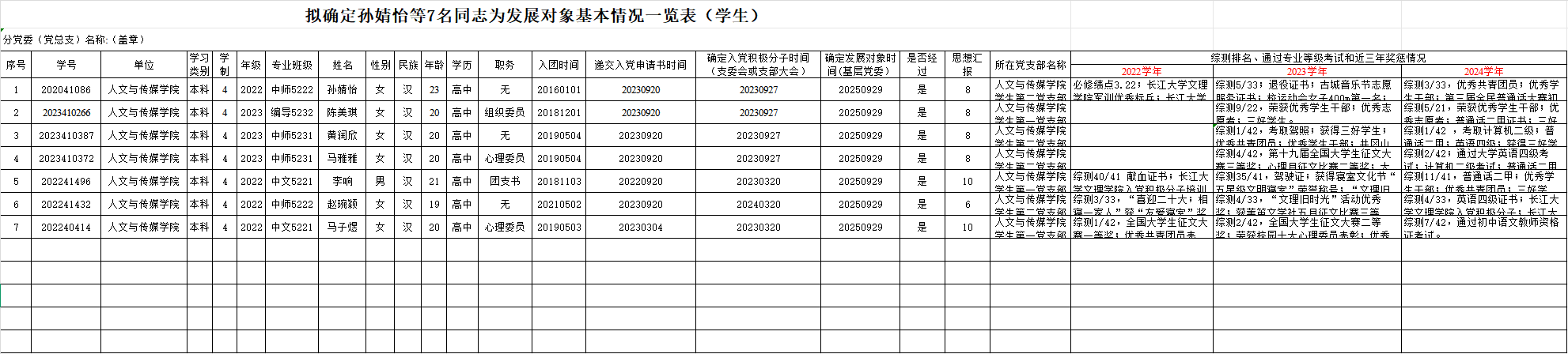 经党支部培养教育和考察,在听取党小组、培养联系人、党员和群众意见的基础上,经支部委员会会议讨论决定并报上级党委备案同意,2025年9月30日确定孙婧怡等7名同志为发展对象。为保证发展新党员的质量,加强对发展党员工作的民主监督,现对发展对象进行公示。