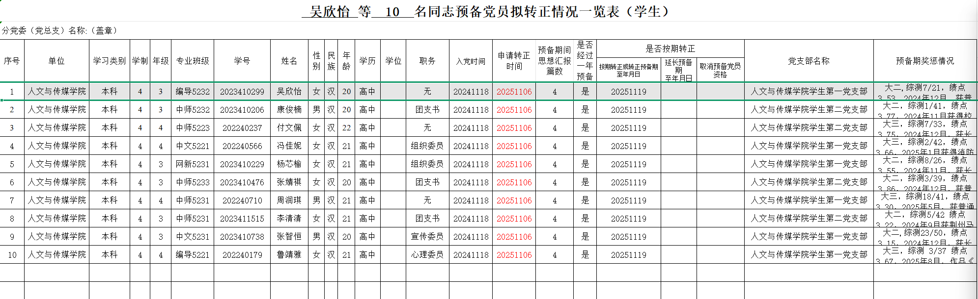 经过党支部对预备党员1年的培养教育和考察,经支部委员会研究确定,报分党委(党总支、党工委)审查同意,将于近期召开党员大会讨论吴欣怡等10名同志预备党员转正事宜,特在人文与传媒学院范围内进行公示。(见附件)