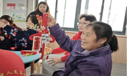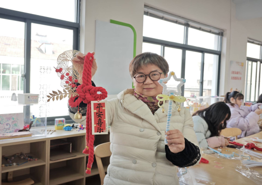 活动现场,学院志愿者为居民讲解万字结的文化寓意与编织方法,大家手持红绳穿绕打结,制作出寓意吉祥万福的万字结挂饰,感受传统文化的美好期许。另一边,扭扭棒魔法棒制作环节同样热闹,居民们弯折、缠绕扭扭棒,搭配彩珠、花朵、星星造型做出创意魔法棒,众人齐动手,现场满是欢声笑语。