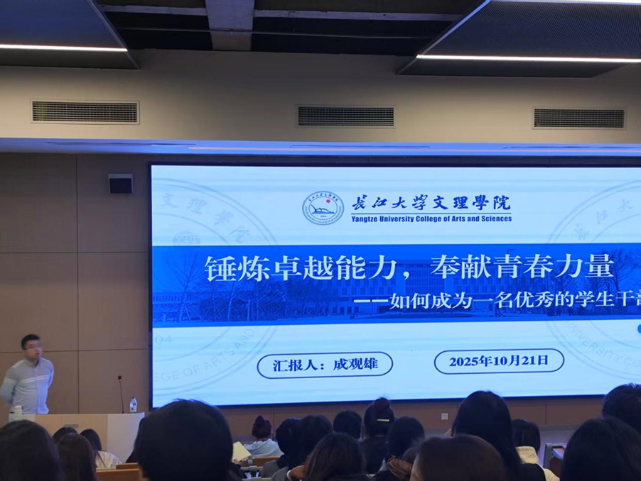 随后,成观雄以《学生干部的使命与担当》为题开展首场讲座,围绕“角色认知、核心素养、能力提升、工作艺术、成长展望”五大方面,引导干部们理解学生工作的价值与责任。