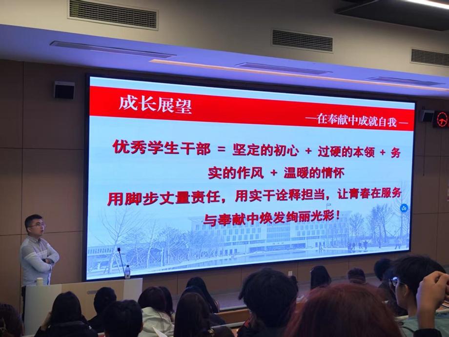 他首先明确:“学生是身份,干部是责任。作为一名学生干部需做好师生的纽带与桥梁、领导和老师的助手、学生的服务者,且兼顾学业做好本职工作。”同时提出,“优秀干部不仅要品学兼优,综合素质较高,更要明白权利与义务。”的基础要求。说明干部应具备的核心素养,分点讲述应该提升的能力,引导学生干部从“知道”到“做到”。结合学生工作中的真实问题,讲解原则与办法。