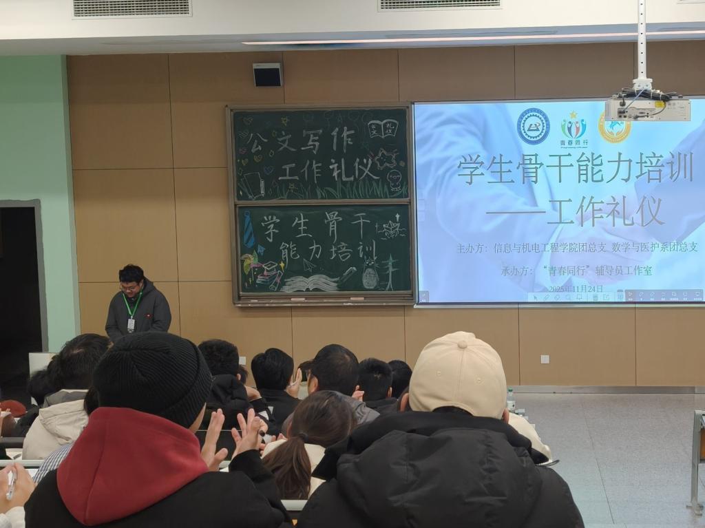 本网讯(见习记者 刘金娜)为提高学生会队伍公文写作规范与基础礼仪素养,适配学生工作需求,数学与医护系和信息与机电工程学院于11月24日19:00在B-213教室联合开展了学生干部工作礼仪和公文写作培训。本次活动由李毅主持,特邀信息学院辅导员王妍柳和数医系辅导员宋静静两位老师担任活动主讲人,两系学生会全体成员共同参与。