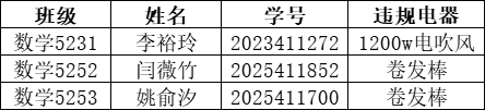 在2025-2026学年第一学期第4-6周系部寝室安全卫生检查中,以下同学被查出在宿舍使用违规电器。根据长江大学文理学院《学生手册》中《长江大学文理学院宿舍管理条例》第三章第十六条及《长江大学文理学院学生违纪处分办法》第二十三条相关规定,给予李裕玲等3名学生系部通报批评的决定,取消本学年评优评先资格。