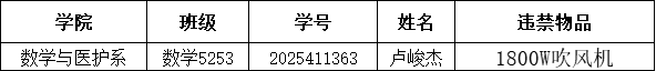在2025-2026学年第一学期第15周寝室安全卫生检查中,以下同学被查出在宿舍使用违规电器。根据长江大学文理学院《学生手册》中《长江大学文理学院宿舍管理条例》第三章第十六条及《长江大学文理学院学生违纪处分办法》第二十三条相关规定,给予卢峻杰系部通报批评的决定,取消其本学年评优评先资格。
