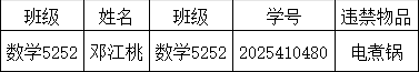 在2025-2026学年第二学期第4周寝室安全卫生检查中,以下同学被查出在宿舍使用违规电器。根据长江大学文理学院《学生手册》中《长江大学文理学院宿舍管理条例》第三章第十六条及《长江大学文理学院学生违纪处分办法》第二十三条相关规定,给予邓江桃系部通报批评的决定,取消其本学年评优评先资格。
