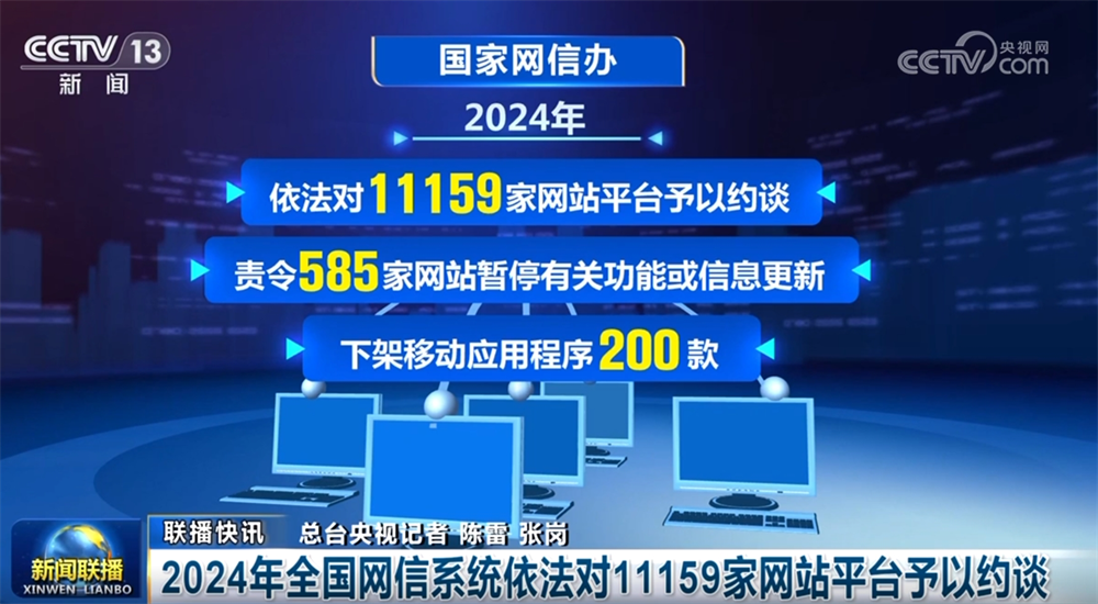 记者从国家网信办获悉,2024年,全国网信系统严厉打击各类网络违法违规行为,依法对11159家网站平台予以约谈,责令585家网站暂停有关功能或信息更新,下架移动应用程序200款,会同电信主管部门取消违法网站许可或备案、关闭违法网站10946家。