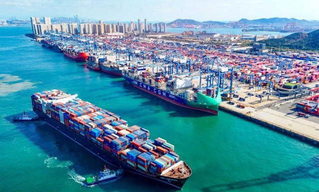 一艘货轮满载货物驶出青岛自贸片区(2025年11月5日摄,无人机照片)。新华社发(张进刚摄)