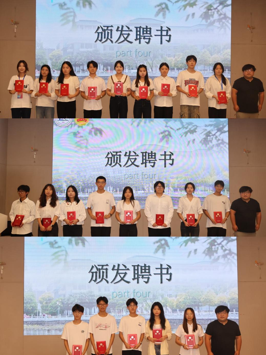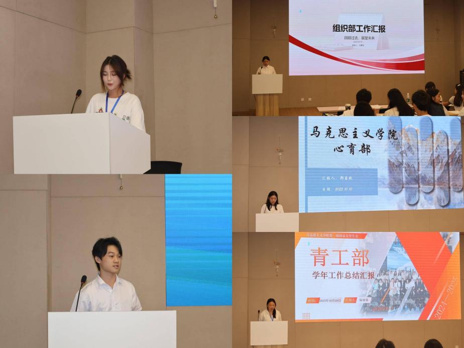 在聘书颁发与表彰环节,辅导员李天赐老师上台为第一届团总支学生会成员颁发聘书,并表彰优秀者:车师节、陈鑫一等 9 人获 “优秀干部”,陈冠宇、刘昊等 14 人获 “优秀干事”,他们的责任感与工作表现获肯定。随后李老师致辞,肯定首届成效,对新一届寄予期望,鼓励传承作风、服务同学与学院,为马克思主义学院贡献力量。