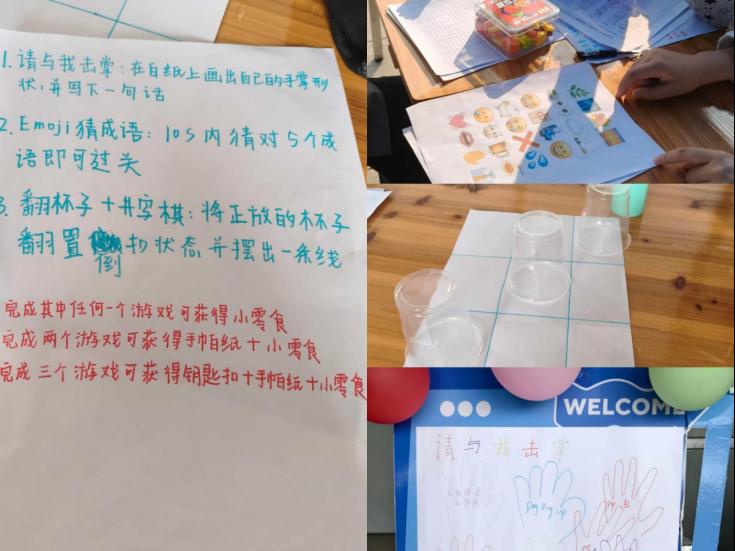 本次活动精心设置了三个创意小游戏,参与者可自由选择。“请与我击掌”环节,同学们在纸上画出自己的手掌轮廓,并写下一句激励的话语,完成一次与自我的对话和约定;“Emoji猜成语”则考验大家的联想与反应速度,在10秒内猜对5个成语,十分精彩;而“翻杯子+井字棋”不仅需要灵巧的手上功夫,更讲究策略布局,充满了乐趣。