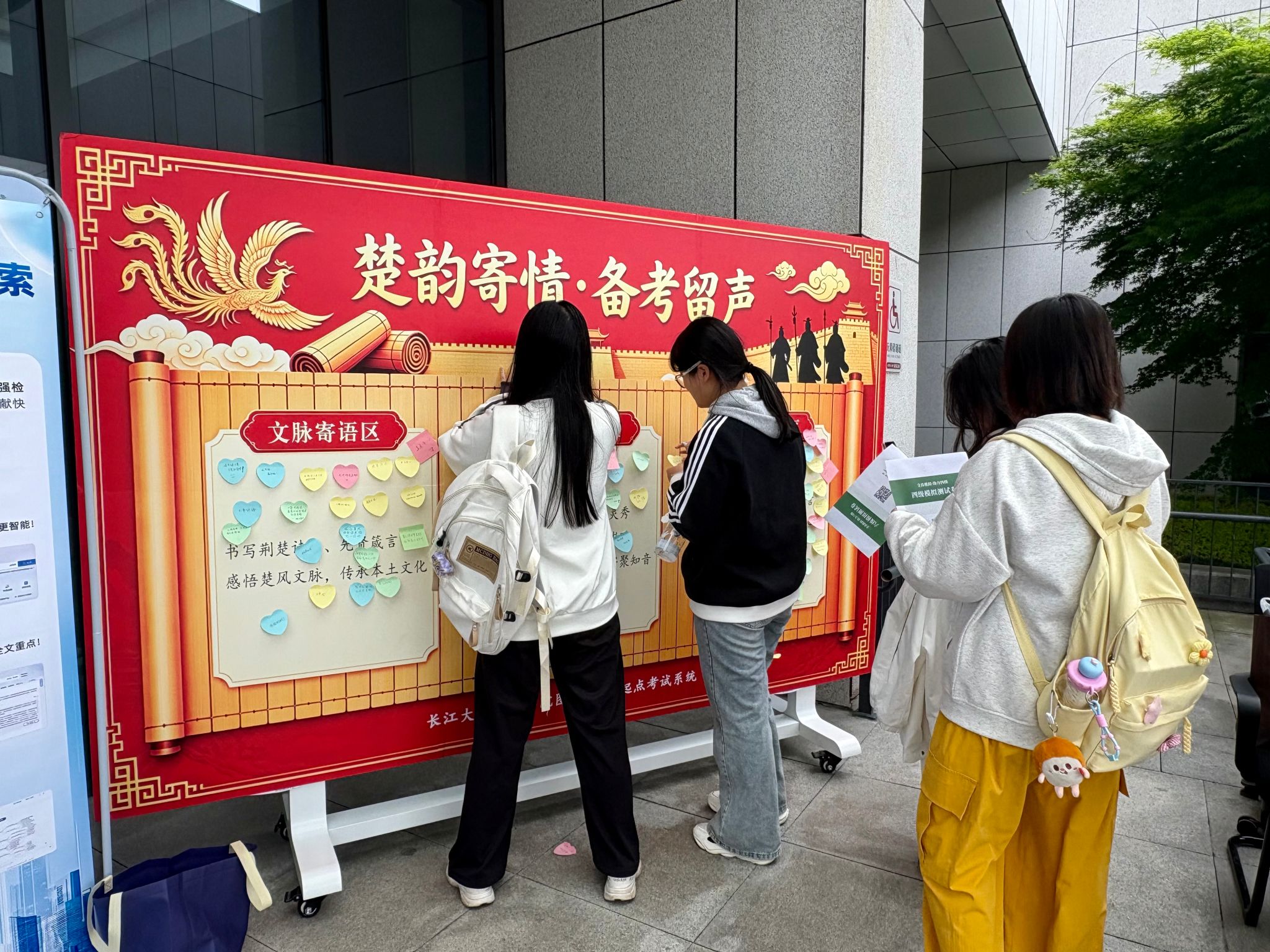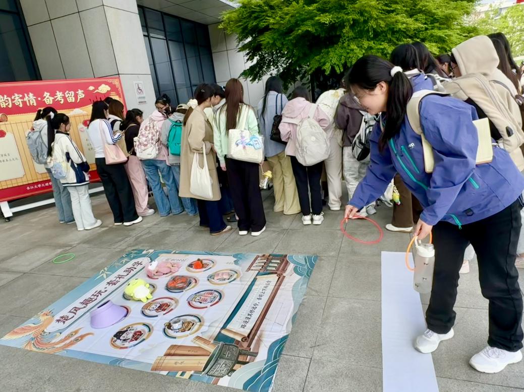 除了干货满满的资源推广,趣味互动环节更是点燃了现场氛围。“书香套圈”游戏区欢声笑语不断,同学们手持套圈,瞄准心仪小奖品,在轻松互动中感受阅读的乐趣;“楚韵寄情 备考留声”墙前,不少师生驻足提笔,写下对阅读的热爱、对好书的推荐与对备考的笃行期许,“以书为友,不负韶华”“推荐《楚文化十五讲》”“备考路漫漫,以阅读沉淀底气,以坚持奔赴目标”等真挚寄语,涵盖阅读感悟、荆楚好书分享与学业奋斗等多个维度,成为活动现场一道温暖的风景线。