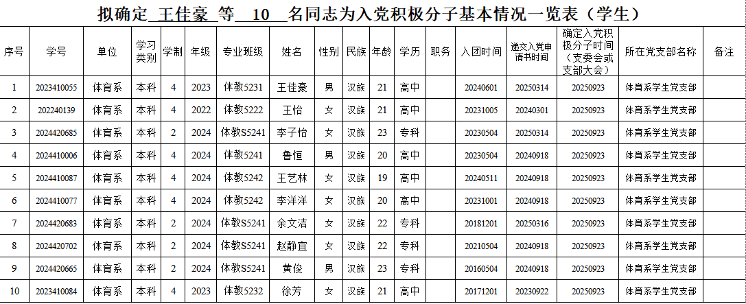 根据党员推荐和团组织推优情况,经支部委员会会议讨论决定并报分党委备案,确定王佳豪等10名同学为入党积极分子,现予以公示。公示时间:2025年9月24日至2025年9月29日(公示时长一般为5个工作日)。