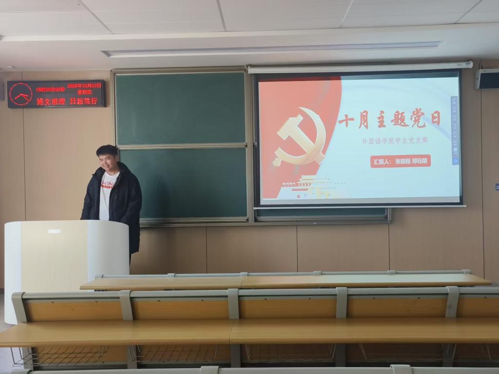 本网讯(通讯员 邓钰朗)2025年10月24日下午15:30外国语学院学生党支部在教学楼C-322开展十月主题党日。此次活动主题为以只争朝夕、永不懈怠的奋斗精神,奋力谱写中国式现代化更加绚丽的篇章!此次活动由张前程同志和邓钰朗同志共同主持。