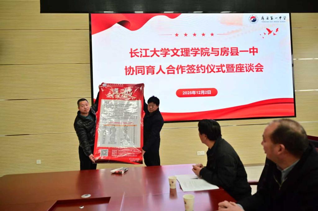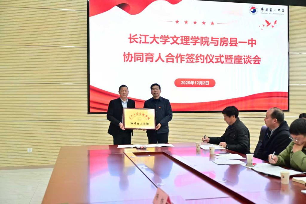 在全体与会人员的共同见证下,长江大学文理学院校长助理曹骥与房县一中魏校长共同签署了《协同育人基地合作协议》,并授牌。这一举措不仅巩固了两校的战略伙伴关系,也为未来持续输送和培育优秀学生建立了制度化通道。