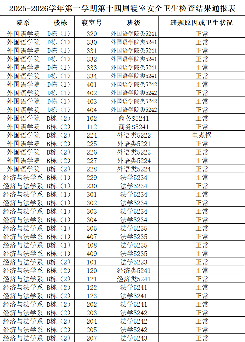 2025-2026学年第一学期第十四周寝室安全卫生检查结果通报表