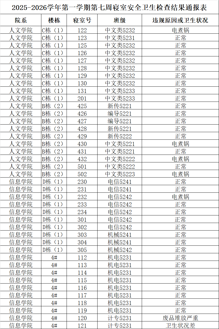 2025-2026学年第一学期第七周寝室安全卫生检查结果通报表